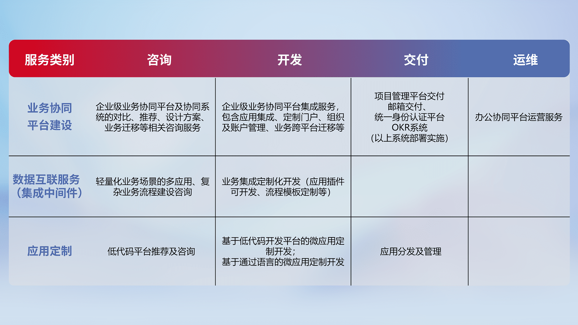 针对钉钉、、企微、、、、IDaas等平台级产品提供产品的规划、、方案、、、交付、、、、定制化开发等服务,,,,实现如统一协同办公、、、智能客户服务、、混合会议管理、、智能数据查询、、、、等业务场景,,,,实现数字化转型。。